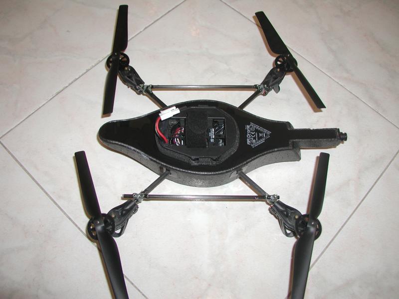 la rumorosita' e' drasticamente diminuita, ed anche la stabilita' e' migliorata, non si ribalta piu', anche se noto quando e' in hovering che la croce ha due braccetti opposti che a volte vibrano , facendo un brutto rumore e destabilizzando per un po' il drone, ma siccome prendere la croce nuova incluso di spese di spedizione viene circa 45 euro, decido di procedere ad una modifica di irrigidimento artigianale, legare tra di loro due braccetti dello stesso lato con una stecca di fibra e della colla epossidica